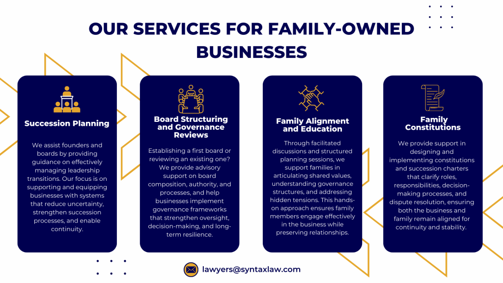 At Syntax Legal Practitioners, we work with family businesses across Nigeria to support long-term stability and succession. Our support goes far beyond drafting paperwork. We advise on structures, assist with leadership development, facilitate difficult but necessary conversations, and help align business strategy with family values.
